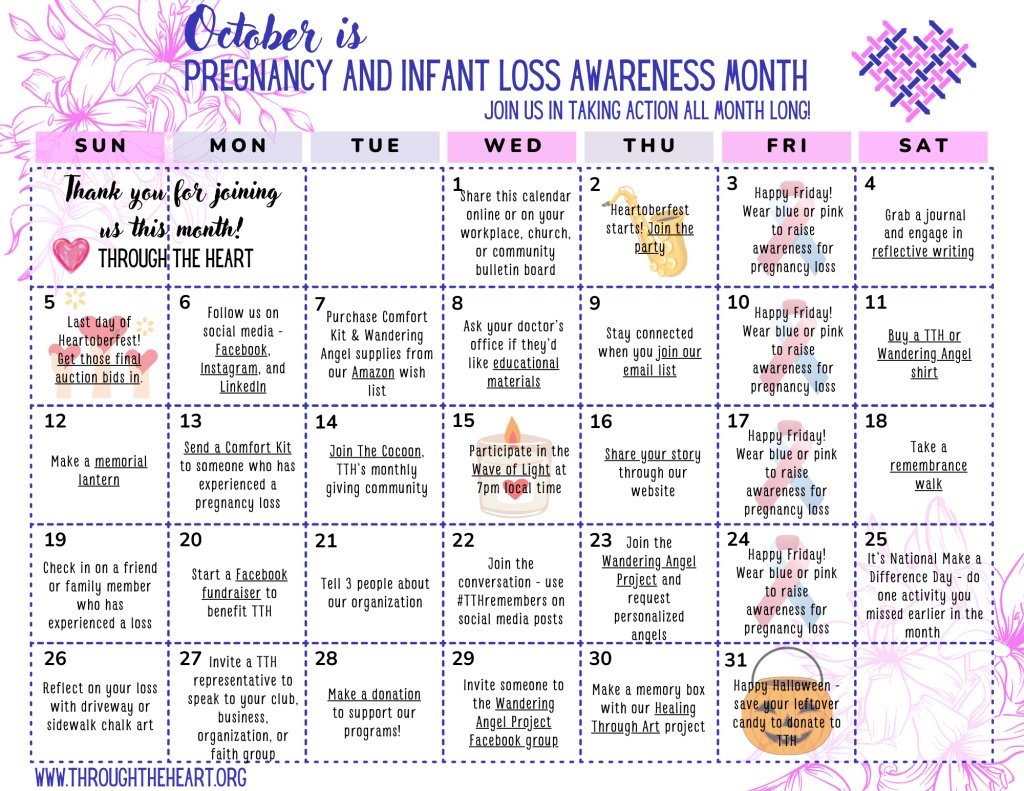 At Through the Heart, we view this day as an opportunity to educate about pregnancy loss but also to provide peace and comfort for those who have experienced a loss and remember the children who where taken from us too soon. We ask you to join us in the following ways: